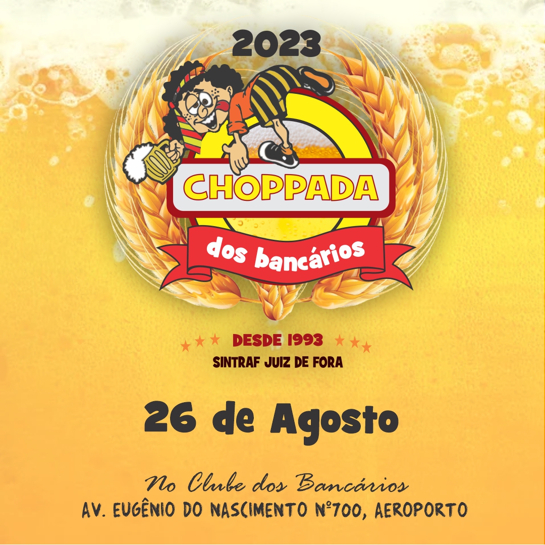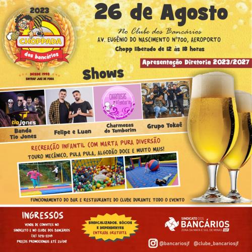 Desde 1993 o Sindicato dos Trabalhadores do Ramo Financeiro da Zona da Mata e Sul de Minas, SINTRAF JF, celebra o Dia d@ Bancári@ com uma grande festa. A Choppada dos Bancários já é um momento muito importante de integração esperado por toda a categoria. Em 2023, o/a Bancário/a é convidado/a a comemorar no próximo sábado, 26 de Agosto, a partir das 12 horas. Muita música e o chopp liberado de 12 às 18 horas fazem a festa ficar super animada. Entre as atrações estão: Banda Tio Jones, Felipe e Luan, Charmosas do Tamborim e Grupo Tokaê. A diversão da criançada também está garantida com brinquedos infláveis, pula pula, recreação infantil, pipoca e algodão doce.