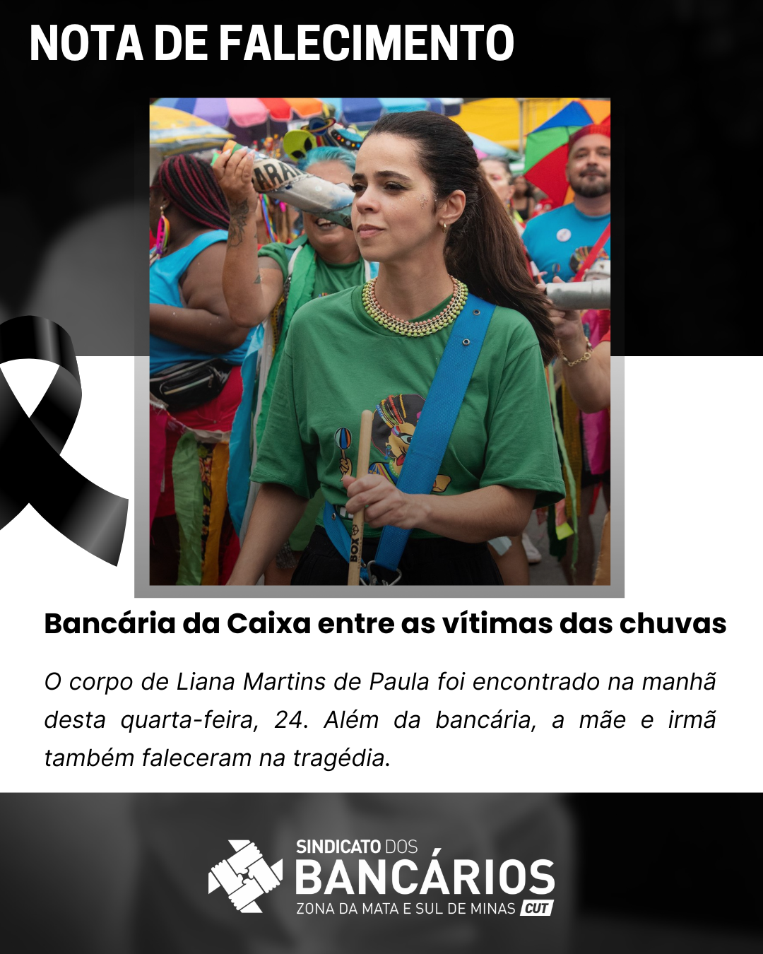 Neste momento de imensa dor, o Sindicato dos Bancários de Juiz de Fora, Zona da Mata e Sul de Minas, lamenta profundamente pela morte da bancária, sua mãe e irmã. Nos solidarizamos com os familiares, amigos e com todos aqueles que tiveram o privilégio de conviver com a Liana.