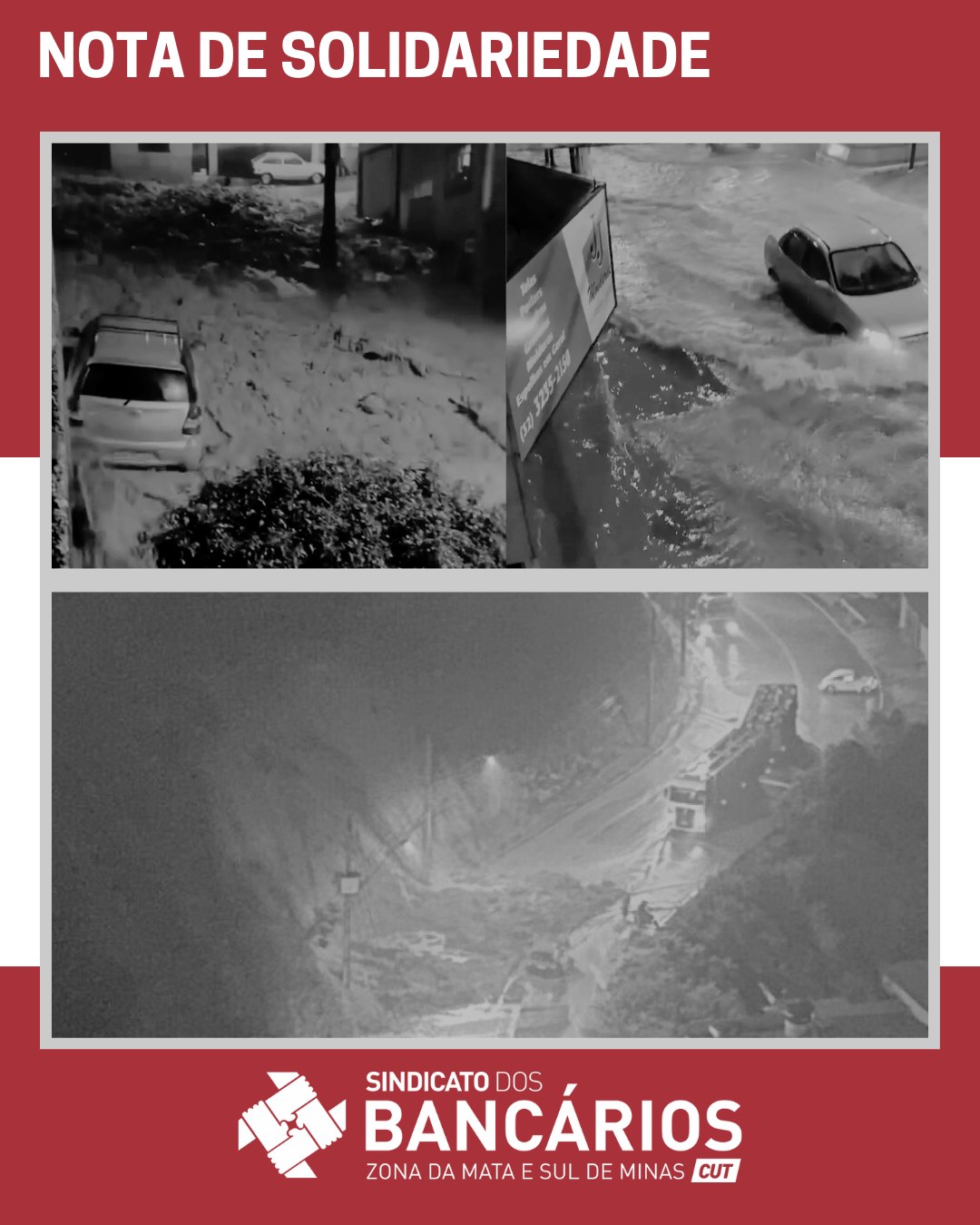 O Sindicato dos Bancários de Juiz de Fora, Zona da Mata e Sul de Minas manifesta sua profunda solidariedade às famílias atingidas pelas fortes chuvas que assolaram o município de Juiz de Fora e diversas cidades da Zona da Mata nos últimos dias, mais intensamente desde a noite desta segunda-feira, 23. Lamentamos profundamente a morte de 40 pessoas até o momento, incluindo crianças e idosos. Entre as vítimas uma bancária da Caixa, Liana Martins de Paula, sua mãe e irmã.