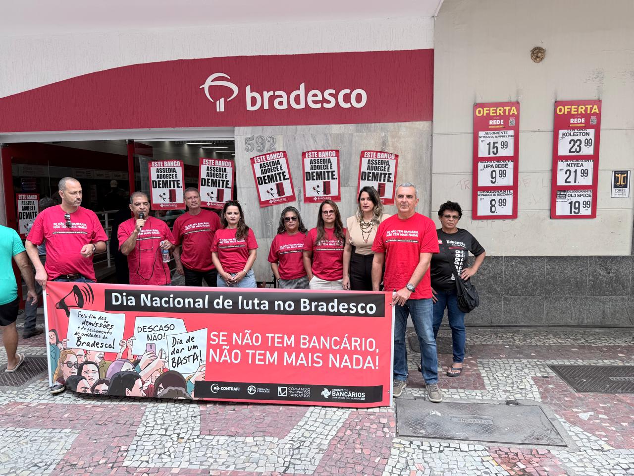 Sindicato dos Bancários realiza ato em agências do Bradesco contra demissões, fechamento de unidades e precarização do atendimento